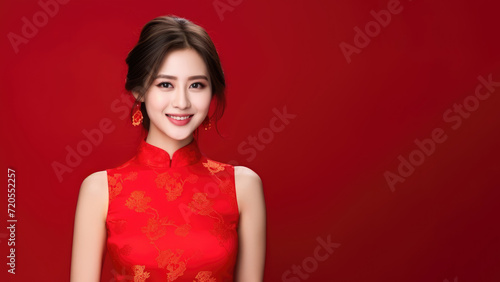 Happy Chinese New Year. Asian woman wearing a traditional cheongsam Isolated on red background.