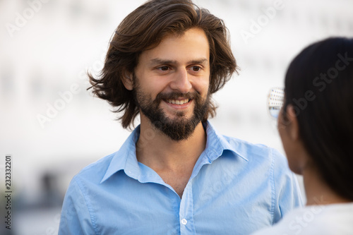 Happy confident Caucasian man talking with partner outdoors. Professional successful couple on urban street. Business concept