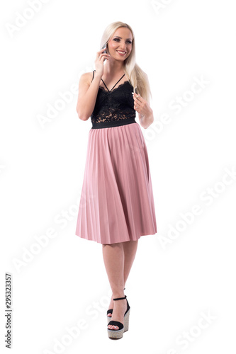 Happy confident young well dressed stylish woman walking and talking on the phone looking away. Full body isolated on white background.