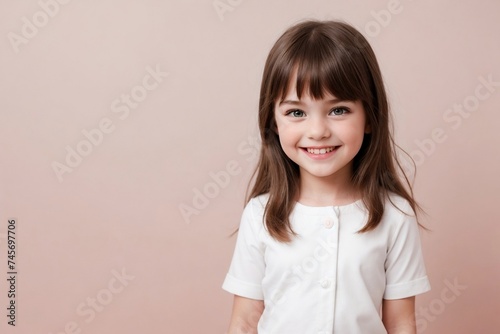 Happy cute little girl wearing white clothes standing against a pink background with copy space.