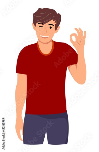 Happy excited young man is standing isolated on a pure background and shows ok sign. Portrait of a guy who shows ok sign. Vector cartoon flat illustration