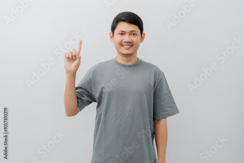 Happy expression of adult Asian man pointing fingers with casual t-shirt isolated on white background