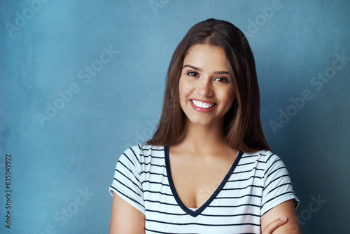 Happy, fashion and portrait of woman on blue background with cheerful, joy and positive expression. Attractive, beauty and face of isolated person smile with confidence, pride and style in studio