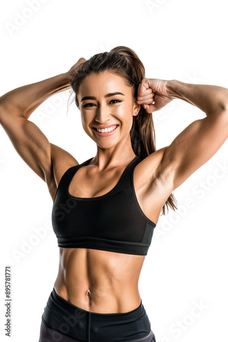 Happy female athlete flexing muscle alone against transparent background