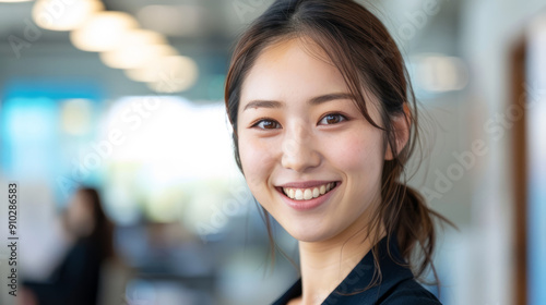 Happy female business professional portrait. Smiling young businesswoman, dressed in a professional suit, poses confidently for a portrait.