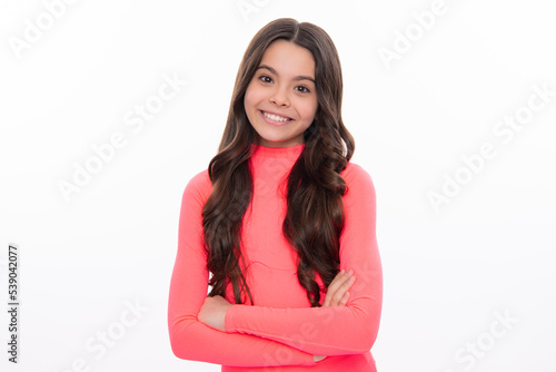 Happy girl face, positive and smiling emotions. Little kid girl 12,13, 14 years old on isolated background. Children studio portrait. Emotional kids face.