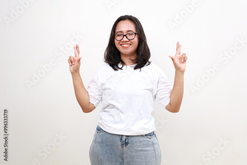 Happy girl feel nervous about her dream work cross fingers bite lips isolated over white background