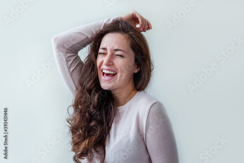 Happy girl smiling. Beauty portrait young happy positive brunette woman isolated on white background. Young european woman portrait, true emotions.