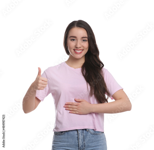 Happy healthy woman touching her belly on white background