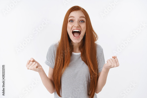 Happy impressed excited cute redhead female college student win first prize screaming surprised clench fists joyfully celebrate success gain victory triumphing smiling cheerful, white background