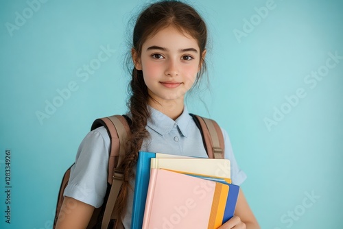 Happy Indian Schoolgirl in Uniform with Backpack and Notebooks in Minimalistic Studio Setting for Education Concept