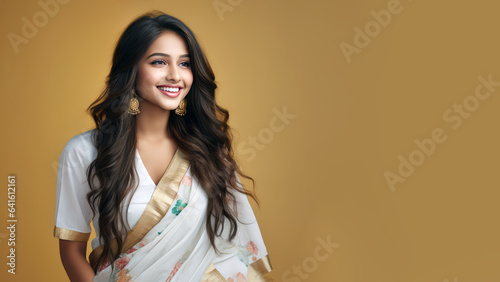 Happy Indian woman in lehenga choli costume, girl in sari cloth