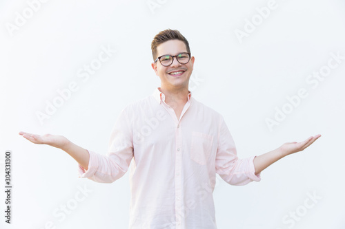 Happy joyful guy in eyeglasses presenting copy space on both sides of him. Young man in glasses standing isolated over white background. Advertising concept