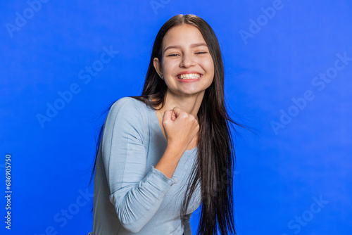 Happy joyful woman celebrating success victory, winning birthday, lottery jackpot goal achievement play game good positive news, triumph. Young smiling brunette girl on blue studio wall background