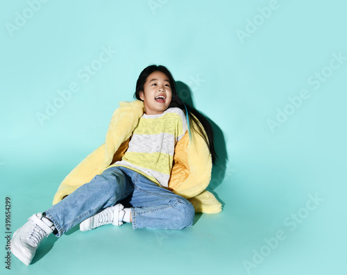 Happy laughing asian kid girl in stylish yellow furry coat, jeans and sneakers sits sprawled on the floor and looks up