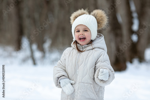 Happy laughing little girl in warm white jacket and white knitted hat has fun and playing with a snow in winter park or forest. Children outdoor activities concept. Happy family time