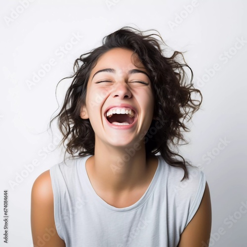happy laughing young woman on isolated white background