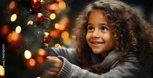 Happy little girl decorating christmas tree at home, winter holidays, charity and people concept. Merry Christmas Holiday concept. Generative AI
