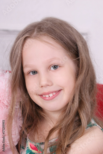 Happy little girl in armchair smiles in white room at home, close up portraiit
