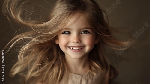 Happy little girl with flowing blonde hair, smiling at camera.