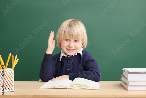 Happy little school child raising hand while sitting at desk with books near chalkboard