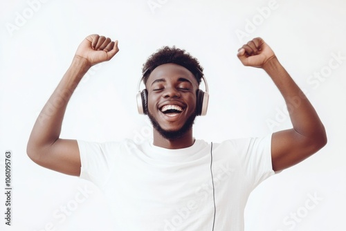 Happy man celebrating with music, wearing headphones and dancing energetically.