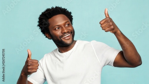 Happy man giving two thumbs up. He's smiling broadly, expressing positivity and approval.