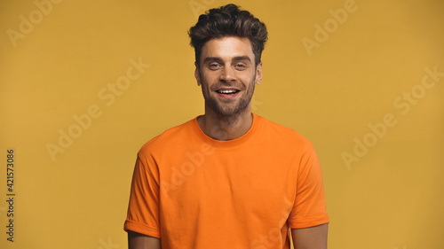 happy man smiling while looking at camera isolated on yellow