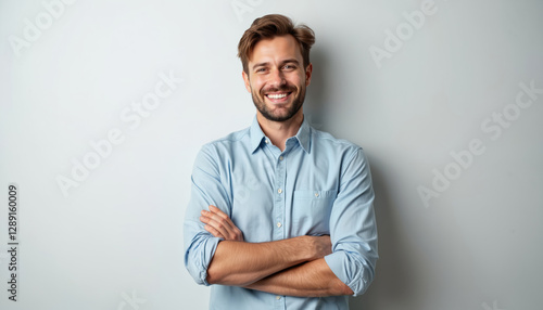 Happy man with beard stands confidently with crossed arms on a white background. He is wearing a light blue shirt. Studio shot of smiling guy looking at camera, successful leader.
