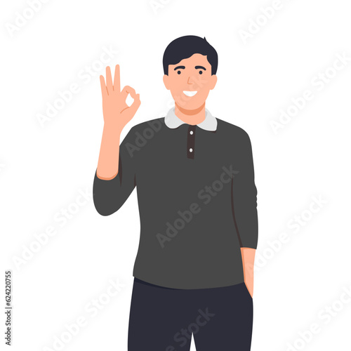 Happy man with win or ok gesture. Young man showing Approved, Accepted, Liked and Excellent sign. Hand communication icon. Flat vector illustration isolated on white background