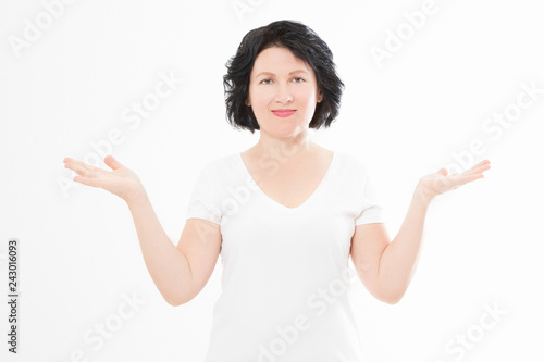 Happy middle age woman in summer blank template t shirt showing copy space for advertising isolated on white background. Copy space. Mock up