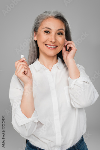 happy middle aged woman in white shirt holding wireless earphone isolated on grey