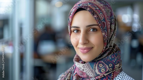 Happy Middle Eastern businesswoman at the office A female executive wearing a headscarf smiles at the camera.