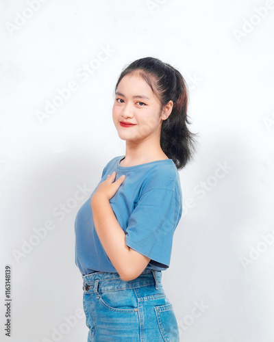 Happy mindful thankful young woman holding hands on chest smiling isolated on white background feeling no stress, gratitude, mental health balance, peace of mind concept.