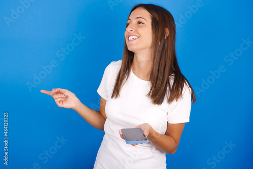 Happy pleased young european girl wearing white t-shirt on white background raises palm and holds cellphone uses high speed internet for text messaging or video calls