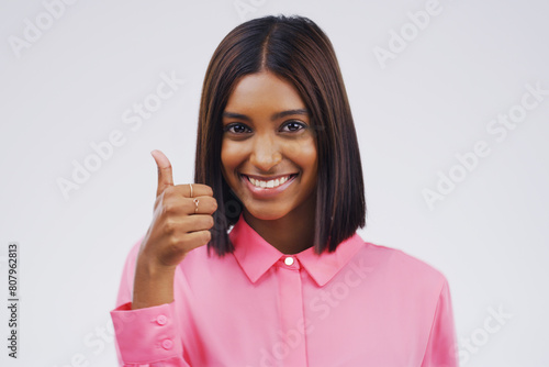 Happy, portrait or Indian woman with thumbs up support in studio for thank you, congratulations or praise on white background. Yes, face or model with OK emoji for success, agree or sign up promotion