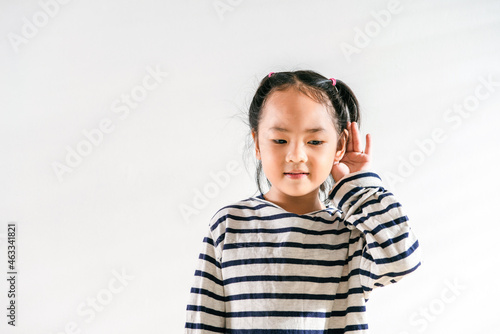 Happy Positive cute Asian little toddler kid girl holding ear with hand listening to a hearing for rumor or gossip. Over white background for text copy and space. Deafness concept