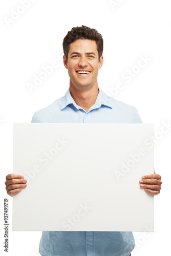 Happy, poster and portrait of man in studio for news, announcement and information. Mockup space, promotion and isolated person with sign, banner and billboard for advertising on white background
