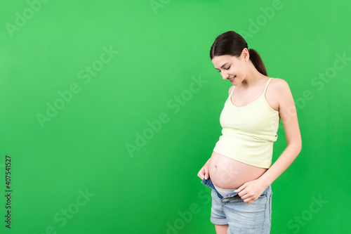 Happy pregnant woman in unzipped jeans showing her naked belly at colorful background with copy space. Baby expecting concept