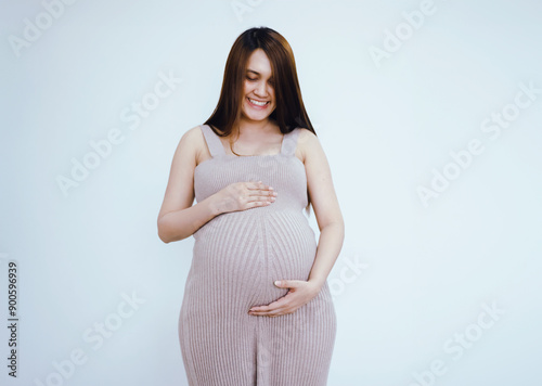 Happy pregnant woman stroking her belly at home with window background