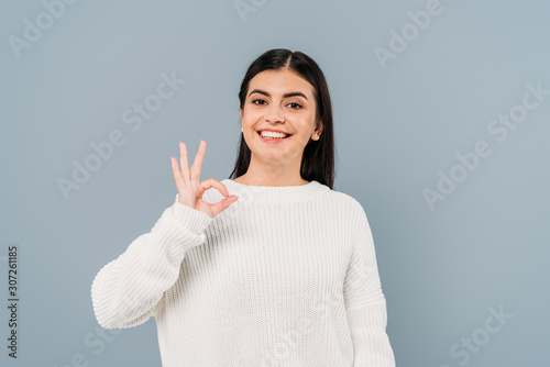 happy pretty brunette girl in white sweater showing ok isolated on grey