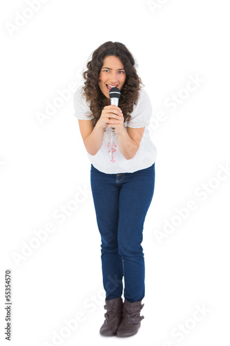 Happy pretty brunette singing with her microphone