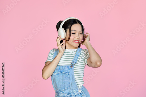 Happy pretty funky young Asian woman with ponytails wearing t-shirt, denim dress and headphones enjoying listening to new trendy pop music mix dancing having fun isolated on pink background.