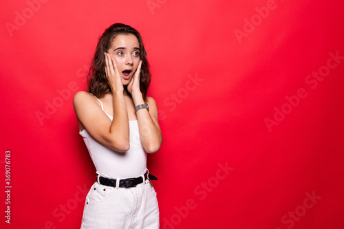 Happy screaming surprised young woman standing isolated over red background. Looking aside.