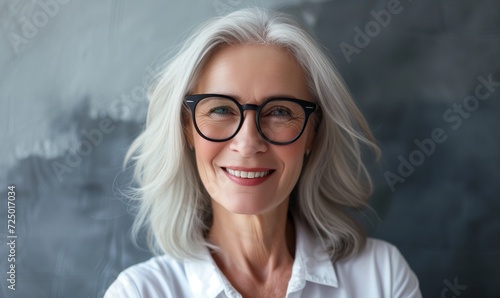 Happy senior caucasian woman in glasses having wide charming smile stand alone indoor pose for camera