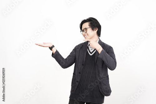 Happy Smile face Showing and Presenting Product on Open Palm Of Handsome Asian Man Isolated On White Background