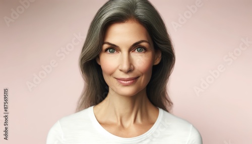 Happy smiling adult female portrait of 50 years old looking at the camera. Close up of sophisticated woman's head against background