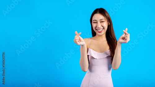Happy smiling Asian female stylish woman giving a mini heart hand gesture isolated in blue background. Expressive girl showing love in full body length studio shot.