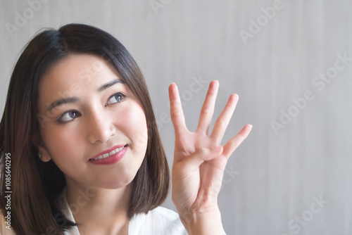 Happy smiling asian woman pointing up four fingers, 4 points gesture