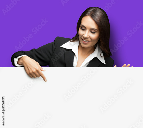 Happy smiling brunette business woman in confident black suit, standing behind, peeping from blank banner or mock up signboard, showing pointing copy space, over violet purple color background.